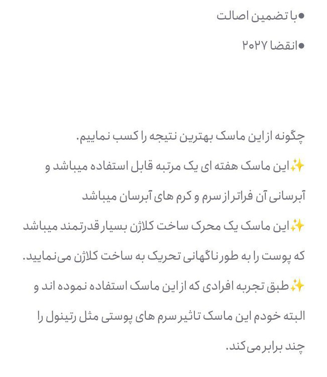 تکرار استفاده: برای نتیجه بهتر، استفاده از ماسک کلاژن بیودنس را به صورت هفتگی یا مطابق با نیاز پوستتان تکرار کنید. برای پوستهای خشک یا کم آب، میتوانید آن را بیشتر استفاده کنید.
